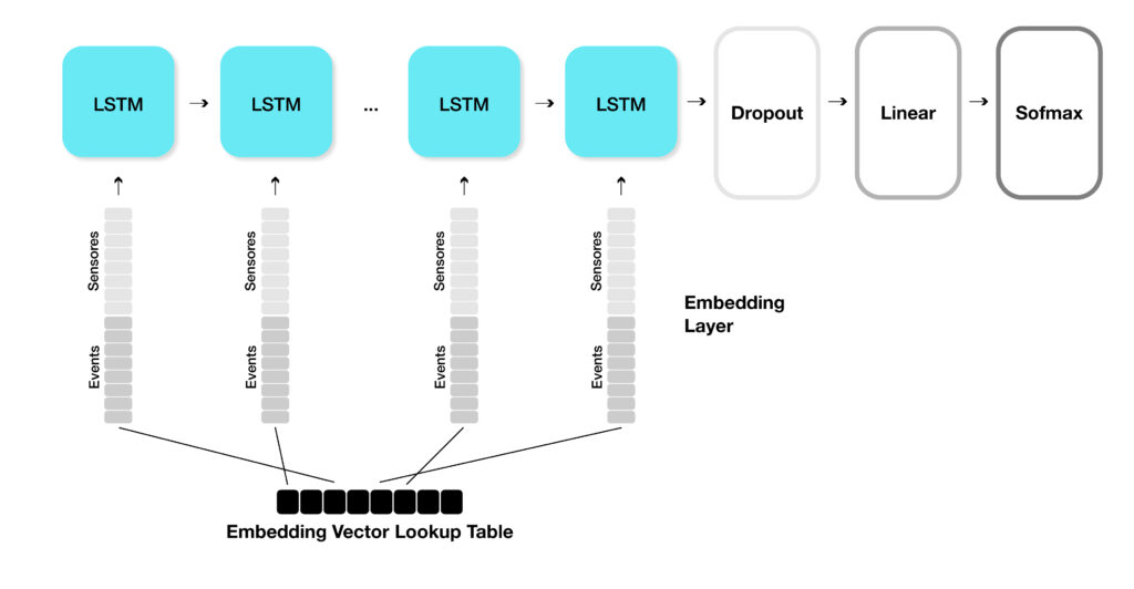 - Inputs: Event IDs and Sensor IDs, each as sequences of length 50.