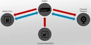 図1:ネットワーク設定:ハッカーは侵害されたECUを用いてサイドから悪意のあるデータを注入する。